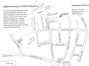 Bitte am Ende der Langemarckstrasse in Münster dem Weg geradeaus kurz in den Wienburgpark folgen und dort hinter dem letzten Haus Langemarckstr. 94 in die Gartenstiege (vor der Kleingartenanlage) einbiegen, etwa 200 m ganz durch gehen, dann auf der linken Seite finden Sie den Eingang zum WIEGA Garten …